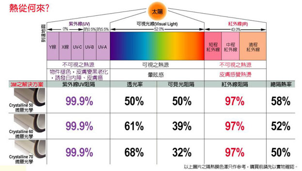 3M™ Crystalline 微層光學隔熱膜是目前市面上表現卓越且能有效降低車箱溫度的玻璃隔熱薄膜,採用了光學折射原理,有效阻隔97%紅外線和99.9%的紫外線。